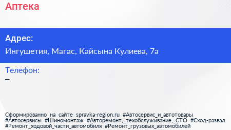 Аптека по адресу Ингушетия, Магас, Кайсына Кулиева, 7а в дальнейшем Организация, размещена в следующих категориях:
