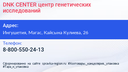 DNK CENTER, центр генетических исследований по адресу Ингушетия, Магас, Кайсына Кулиева, 26 в дальнейшем Организация, размещена в следующих категориях: