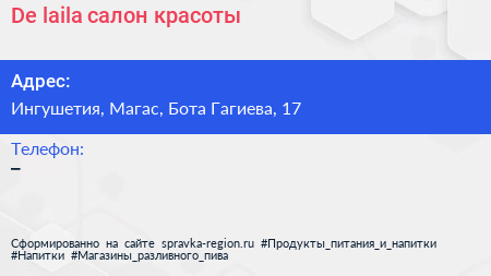 De laila, салон красоты по адресу Ингушетия, Магас, Бота Гагиева, 17 в дальнейшем Организация, размещена в следующих категориях: