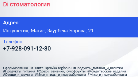Di, стоматология по адресу Ингушетия, Магас, Заурбека Борова, 21 в дальнейшем Организация, размещена в следующих категориях: