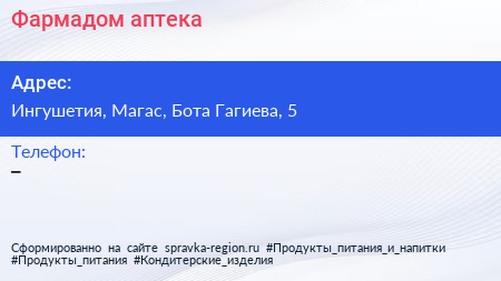 Фармадом, аптека по адресу Ингушетия, Магас, Бота Гагиева, 5 в дальнейшем Организация, размещена в следующих категориях: