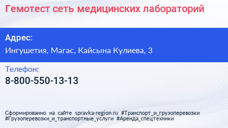 Гемотест, сеть медицинских лабораторий по адресу Ингушетия, Магас, Кайсына Кулиева, 3 в дальнейшем Организация, размещена в следующих категориях: