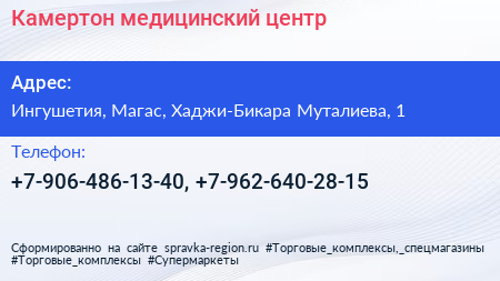 Камертон, медицинский центр по адресу Ингушетия, Магас, Хаджи-Бикара Муталиева, 1 в дальнейшем Организация, размещена в следующих категориях: