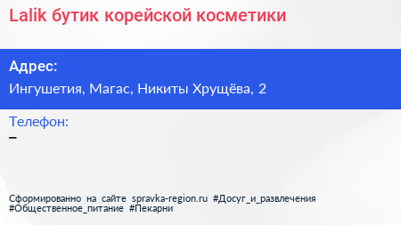Lalik, бутик корейской косметики по адресу Ингушетия, Магас, Никиты Хрущёва, 2 в дальнейшем Организация, размещена в следующих категориях: