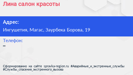 Лина, салон красоты по адресу Ингушетия, Магас, Заурбека Борова, 19 в дальнейшем Организация, размещена в следующих категориях: