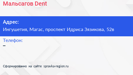 Мальсагов-Dent по адресу Ингушетия, Магас, проспект Идриса Зязикова, 52в в дальнейшем Организация, размещена в следующих категориях: