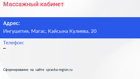 Массажный кабинет по адресу Ингушетия, Магас, Кайсына Кулиева, 20 в дальнейшем Организация, размещена в следующих категориях: