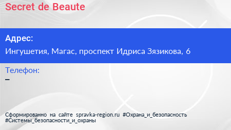 Secret de Beaute по адресу Ингушетия, Магас, проспект Идриса Зязикова, 6 в дальнейшем Организация, размещена в следующих категориях:
