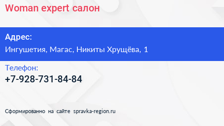 Woman expert, салон по адресу Ингушетия, Магас, Никиты Хрущёва, 1 в дальнейшем Организация, размещена в следующих категориях: