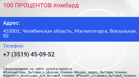 100 ПРОЦЕНТОВ, ломбард по адресу 455001, Челябинская область, Магнитогорск, Вокзальная, 82 в дальнейшем Организация, размещена в следующих категориях: