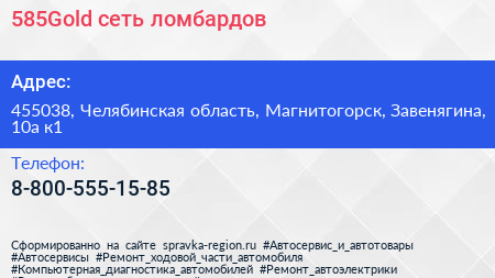 585Gold, сеть ломбардов по адресу 455038, Челябинская область, Магнитогорск, Завенягина, 10а к1 в дальнейшем Организация, размещена в следующих категориях: