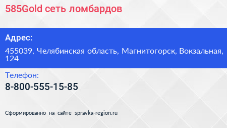 585Gold, сеть ломбардов по адресу 455039, Челябинская область, Магнитогорск, Вокзальная, 124 в дальнейшем Организация, размещена в следующих категориях: