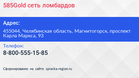 585Gold, сеть ломбардов по адресу 455044, Челябинская область, Магнитогорск, проспект Карла Маркса, 93 в дальнейшем Организация, размещена в следующих категориях: