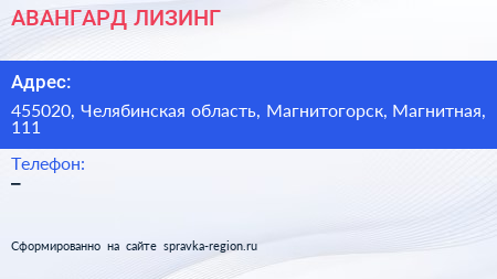 АВАНГАРД ЛИЗИНГ по адресу 455020, Челябинская область, Магнитогорск, Магнитная, 111 в дальнейшем Организация, размещена в следующих категориях: