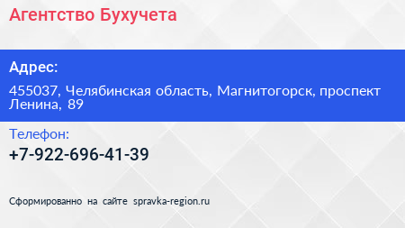 Агентство Бухучета по адресу 455037, Челябинская область, Магнитогорск, проспект Ленина, 89 в дальнейшем Организация, размещена в следующих категориях: