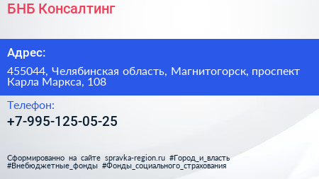 БНБ Консалтинг по адресу 455044, Челябинская область, Магнитогорск, проспект Карла Маркса, 108 в дальнейшем Организация, размещена в следующих категориях: