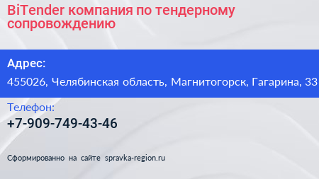 BiTender, компания по тендерному сопровождению по адресу 455026, Челябинская область, Магнитогорск, Гагарина, 33 в дальнейшем Организация, размещена в следующих категориях: