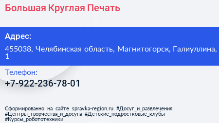 Большая Круглая Печать по адресу 455038, Челябинская область, Магнитогорск, Галиуллина, 1 в дальнейшем Организация, размещена в следующих категориях: