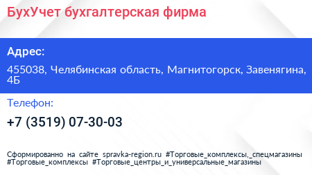 БухУчет, бухгалтерская фирма по адресу 455038, Челябинская область, Магнитогорск, Завенягина, 4Б в дальнейшем Организация, размещена в следующих категориях: