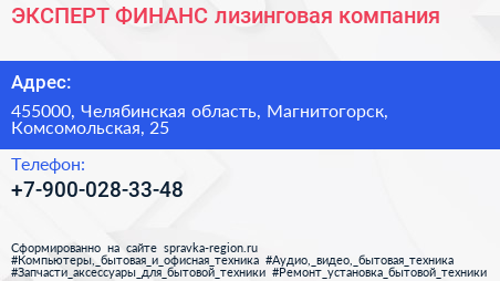 ЭКСПЕРТ-ФИНАНС, лизинговая компания по адресу 455000, Челябинская область, Магнитогорск, Комсомольская, 25 в дальнейшем Организация, размещена в следующих категориях: