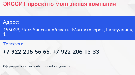 ЭКССИТ, проектно-монтажная компания по адресу 455038, Челябинская область, Магнитогорск, Галиуллина, 1 в дальнейшем Организация, размещена в следующих категориях: