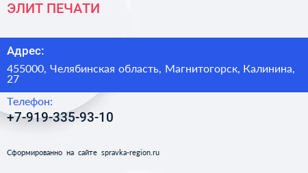 ЭЛИТ ПЕЧАТИ по адресу 455000, Челябинская область, Магнитогорск, Калинина, 27 в дальнейшем Организация, размещена в следующих категориях: