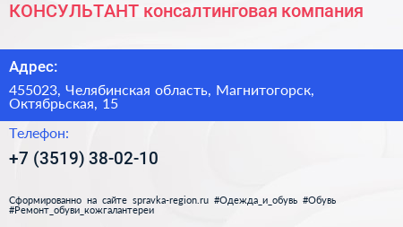 КОНСУЛЬТАНТ, консалтинговая компания по адресу 455023, Челябинская область, Магнитогорск, Октябрьская, 15 в дальнейшем Организация, размещена в следующих категориях: