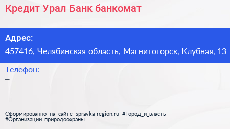 Кредит Урал Банк, банкомат по адресу 457416, Челябинская область, Магнитогорск, Клубная, 13 в дальнейшем Организация, размещена в следующих категориях: