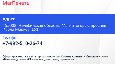 МагПечать по адресу 455038, Челябинская область, Магнитогорск, проспект Карла Маркса, 151 в дальнейшем Организация, размещена в следующих категориях: