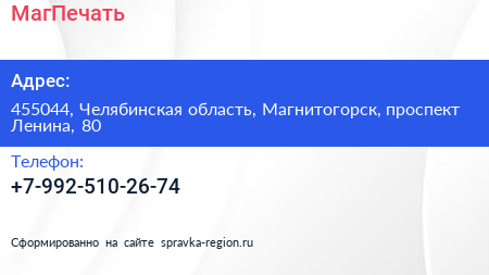 МагПечать по адресу 455044, Челябинская область, Магнитогорск, проспект Ленина, 80 в дальнейшем Организация, размещена в следующих категориях: