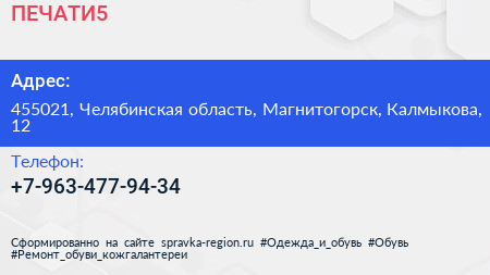 ПЕЧАТИ5 по адресу 455021, Челябинская область, Магнитогорск, Калмыкова, 12 в дальнейшем Организация, размещена в следующих категориях: