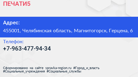 ПЕЧАТИ5 по адресу 455001, Челябинская область, Магнитогорск, Герцена, 6 в дальнейшем Организация, размещена в следующих категориях: