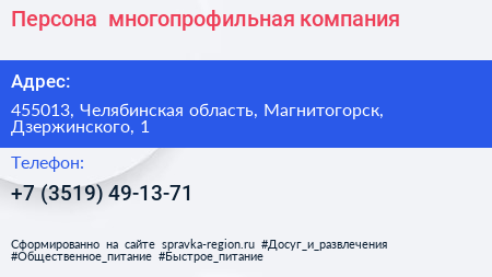 Персона+, многопрофильная компания по адресу 455013, Челябинская область, Магнитогорск, Дзержинского, 1 в дальнейшем Организация, размещена в следующих категориях: