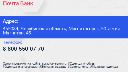 Почта Банк по адресу 455034, Челябинская область, Магнитогорск, 50-летия Магнитки, 45 в дальнейшем Организация, размещена в следующих категориях: