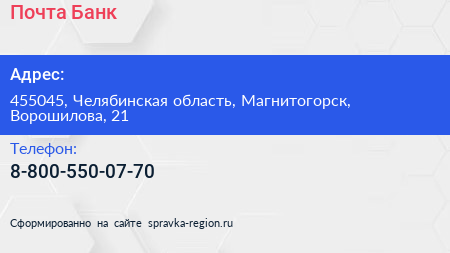 Почта Банк по адресу 455045, Челябинская область, Магнитогорск, Ворошилова, 21 в дальнейшем Организация, размещена в следующих категориях: