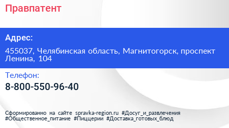 Правпатент по адресу 455037, Челябинская область, Магнитогорск, проспект Ленина, 104 в дальнейшем Организация, размещена в следующих категориях:
