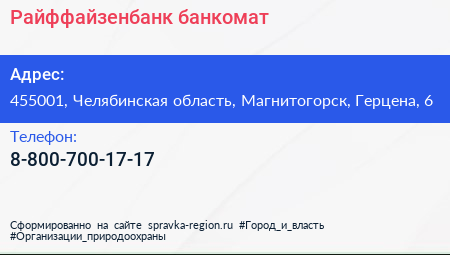 Райффайзенбанк, банкомат по адресу 455001, Челябинская область, Магнитогорск, Герцена, 6 в дальнейшем Организация, размещена в следующих категориях: