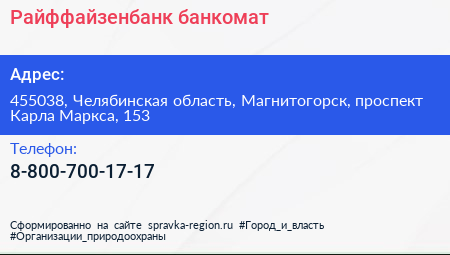 Райффайзенбанк, банкомат по адресу 455038, Челябинская область, Магнитогорск, проспект Карла Маркса, 153 в дальнейшем Организация, размещена в следующих категориях: