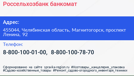 Россельхозбанк, банкомат по адресу 455044, Челябинская область, Магнитогорск, проспект Ленина, 92 в дальнейшем Организация, размещена в следующих категориях: