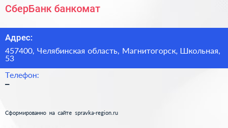 СберБанк, банкомат по адресу 457400, Челябинская область, Магнитогорск, Школьная, 53 в дальнейшем Организация, размещена в следующих категориях: