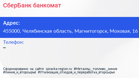 СберБанк, банкомат по адресу 455000, Челябинская область, Магнитогорск, Моховая, 16 в дальнейшем Организация, размещена в следующих категориях: