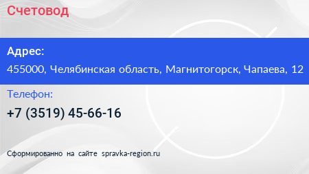 Для связи с организацией воспользуйтесь номером телефона: +7 (3519) 45-66-16. Пн: c 09:00-17:30, Вт: c 09:00-17:30, Ср: c 09:00-17:30, Чт: c 09:00-17:30, Пт: c 09:00-17:30, Сб: выходной, Вс: выходной, вы можете обратиться в эту организацию.