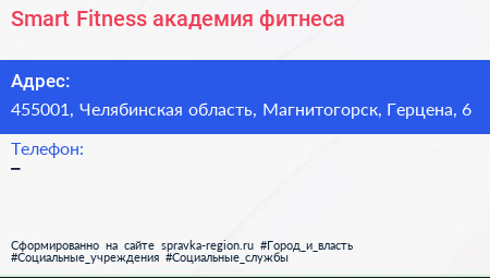 Smart Fitness, академия фитнеса по адресу 455001, Челябинская область, Магнитогорск, Герцена, 6 в дальнейшем Организация, размещена в следующих категориях: