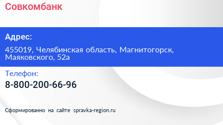 Совкомбанк по адресу 455019, Челябинская область, Магнитогорск, Маяковского, 52а в дальнейшем Организация, размещена в следующих категориях: