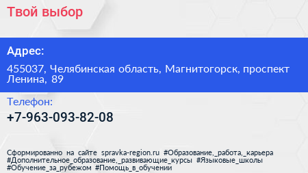 Твой выбор по адресу 455037, Челябинская область, Магнитогорск, проспект Ленина, 89 в дальнейшем Организация, размещена в следующих категориях: