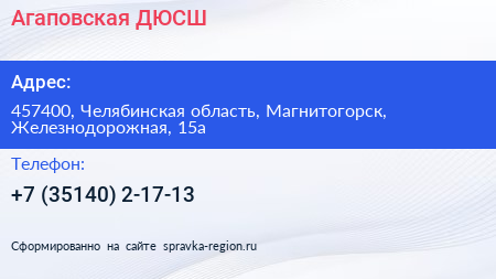 Агаповская ДЮСШ по адресу 457400, Челябинская область, Магнитогорск, Железнодорожная, 15а в дальнейшем Организация, размещена в следующих категориях: