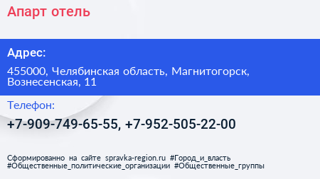 Апарт-отель по адресу 455000, Челябинская область, Магнитогорск, Вознесенская, 11 в дальнейшем Организация, размещена в следующих категориях:
