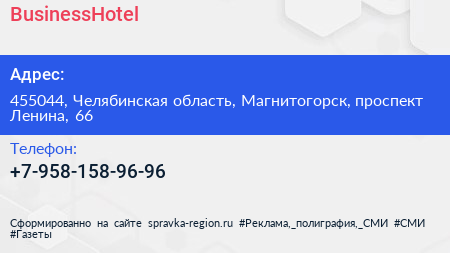 BusinessHotel по адресу 455044, Челябинская область, Магнитогорск, проспект Ленина, 66 в дальнейшем Организация, размещена в следующих категориях:
