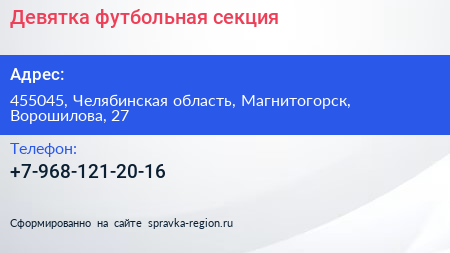 Девятка, футбольная секция по адресу 455045, Челябинская область, Магнитогорск, Ворошилова, 27 в дальнейшем Организация, размещена в следующих категориях: