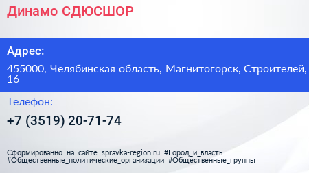 Динамо, СДЮСШОР по адресу 455000, Челябинская область, Магнитогорск, Строителей, 16 в дальнейшем Организация, размещена в следующих категориях:
